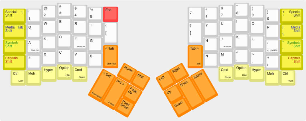 The Forward Tab and Backward Tab keys are in their locations mostly because I ended up with two extra buttons and needed something to do with them. My muscle memory from using the Truly Ergonomic Keyboard makes me look for the Tab key with my right index finger, so it is handy to have this redundant Tab, and the idea with the Backward Tab key is that it becomes easy to navigate text fields in forms, or to indent/unindent code.
