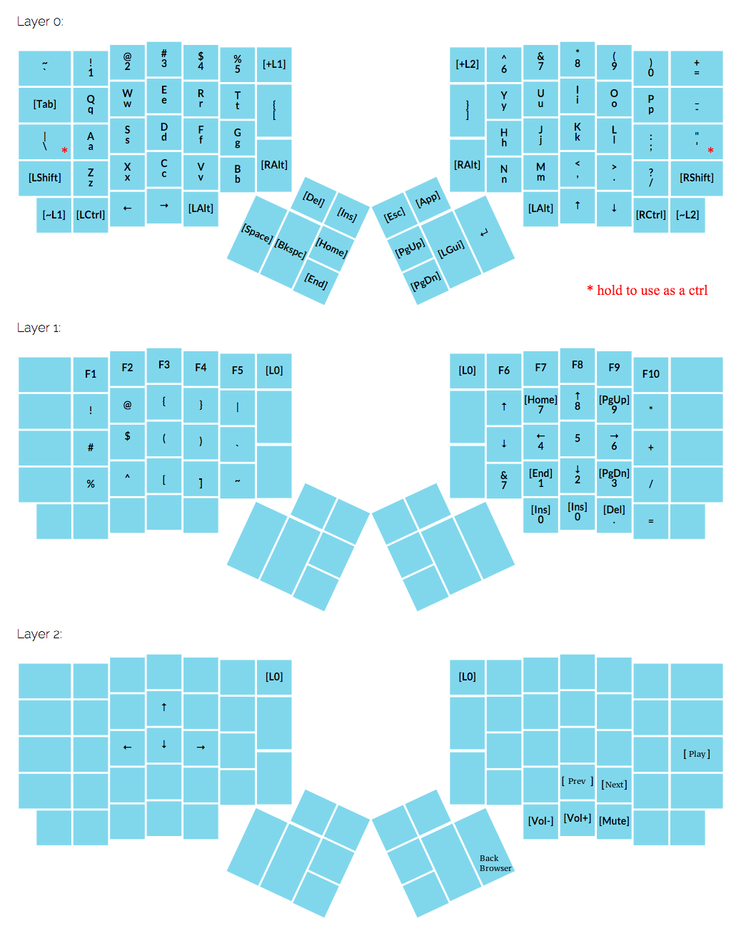 Since I'm an Emacs user, ctrl keys are very important and gets a placement where the usual caps_lock is. There are an extra pair of ctrls, just in case there where problems with the holding one's, but not as comfortable.